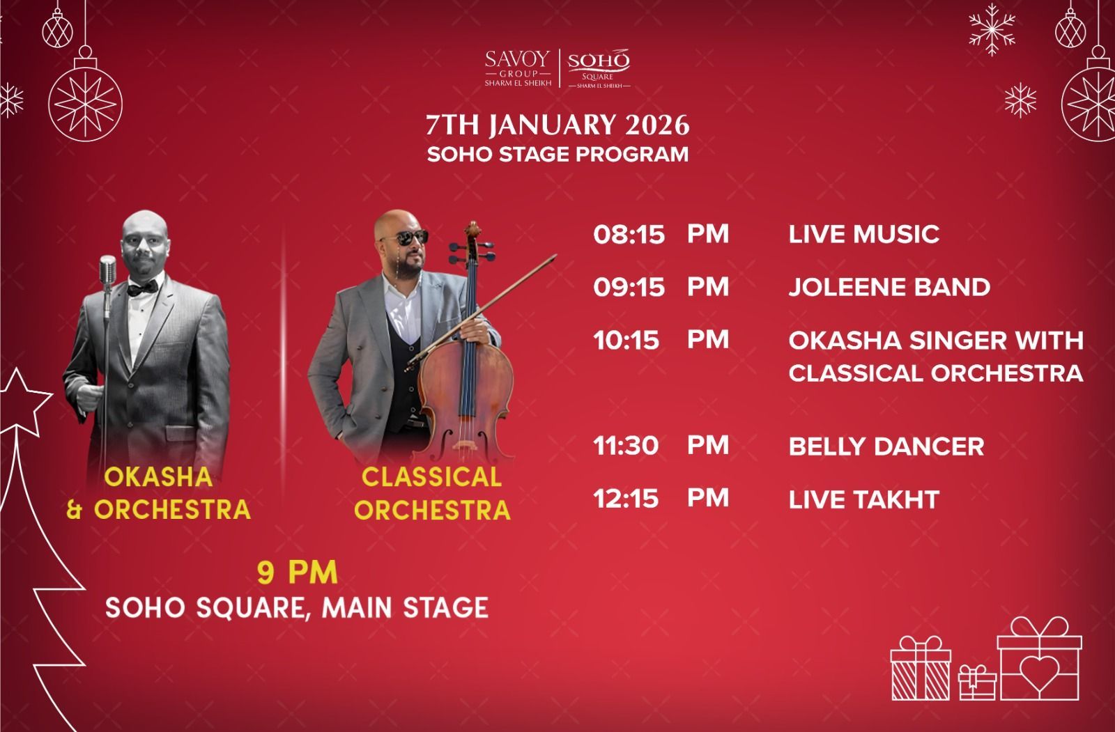 brings together locals and foreigners to celebrate in a joyful, vibrant atmosphere. This magical event transforms Soho Square into a festive wonderland, making it a key highlight in Sharm El Sheikh’s holiday calendar and a must-attend moment for guests of all ages.
